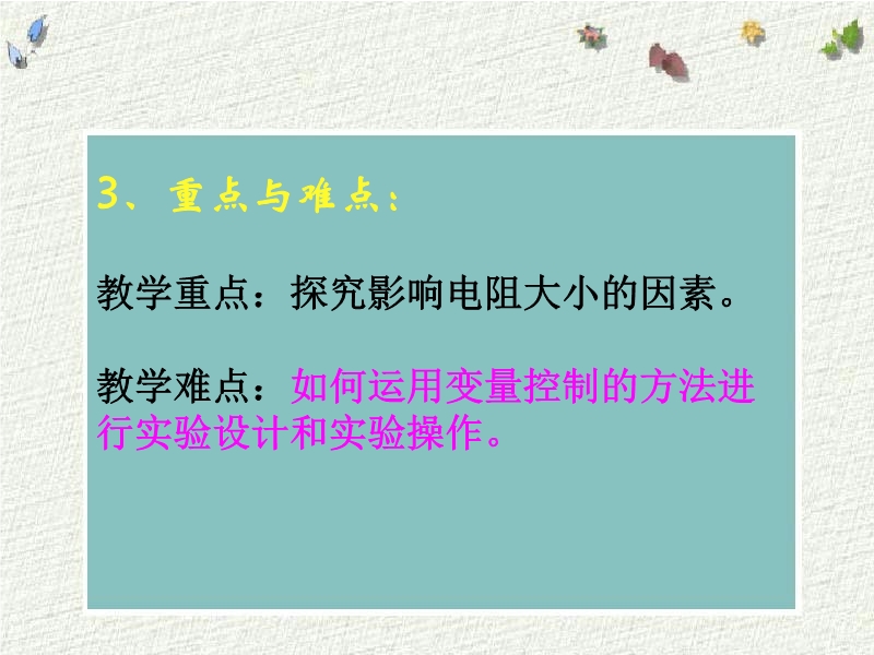 重 点:让学生经历从猜想到制定实验方案的过程,理解决定电阻大小的因素。