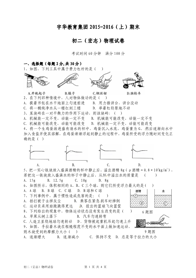 开封市祥符区2015-2016学年第一学期期末考试八年级物理试题及答案