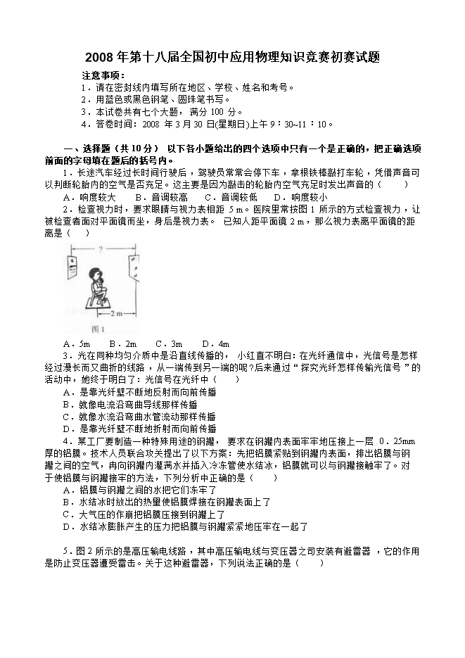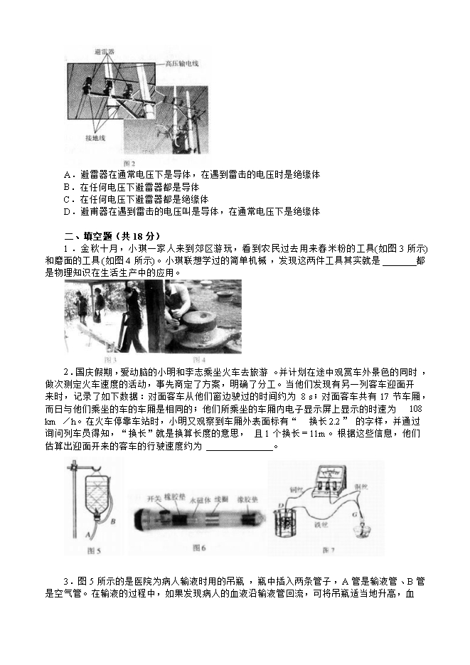 2.本卷试题中g值均取10N/kg。一、填空题(第1题到第8题每空1分,第9、10题每空2分,共28分;将答案直接写在横线上,不必写出解题过程。)
