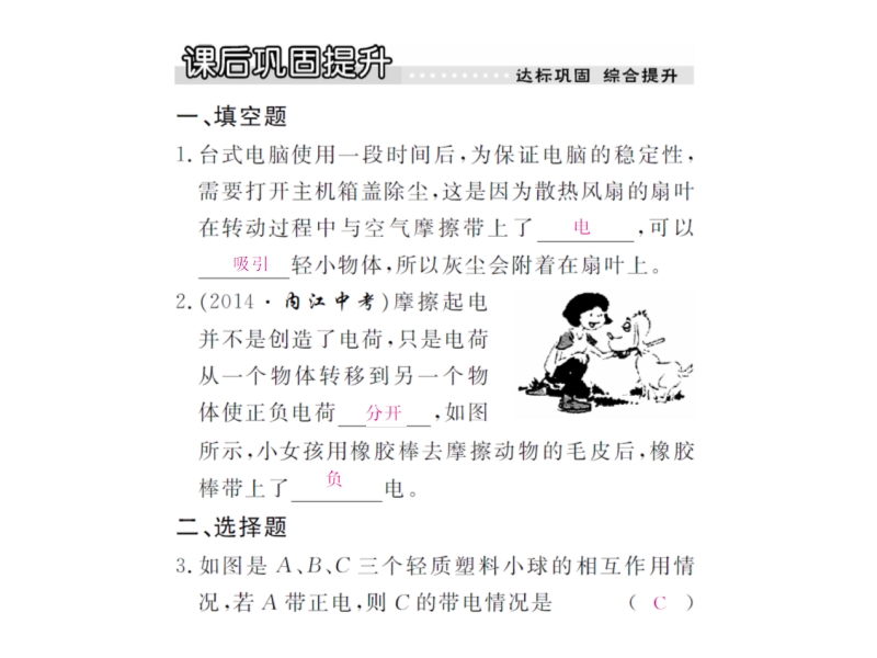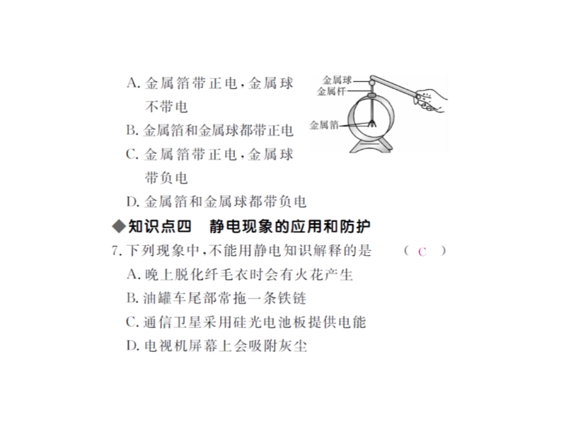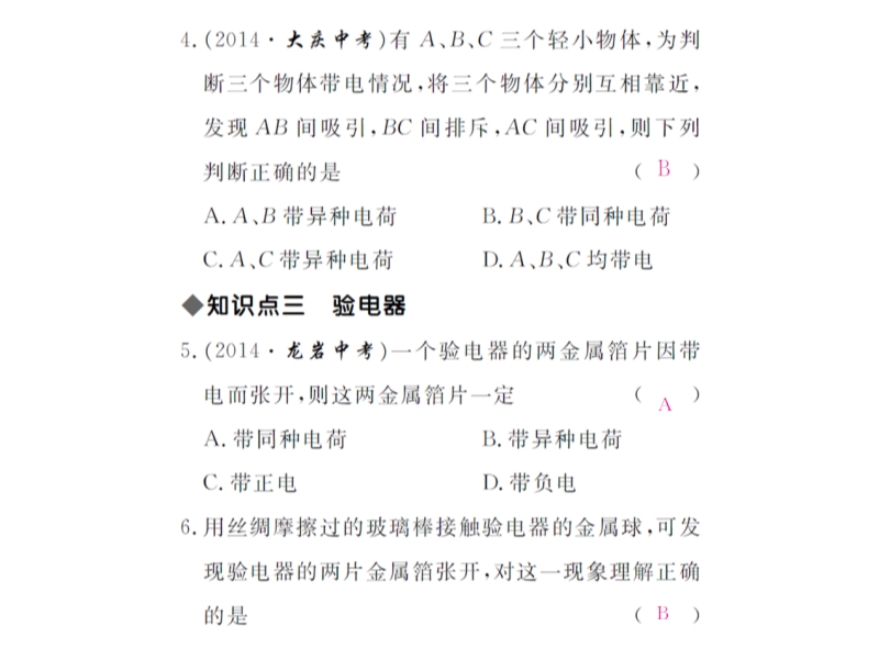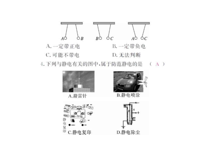 4、甲、乙、丙三个轻质小球,任意两个靠近均相互吸引,已知甲带正电,则乙球不可能带______电,若丙球能吸引不带电的轻小物体,则乙球____ ___(选填“带正电”、“带负电”、“不带电”)