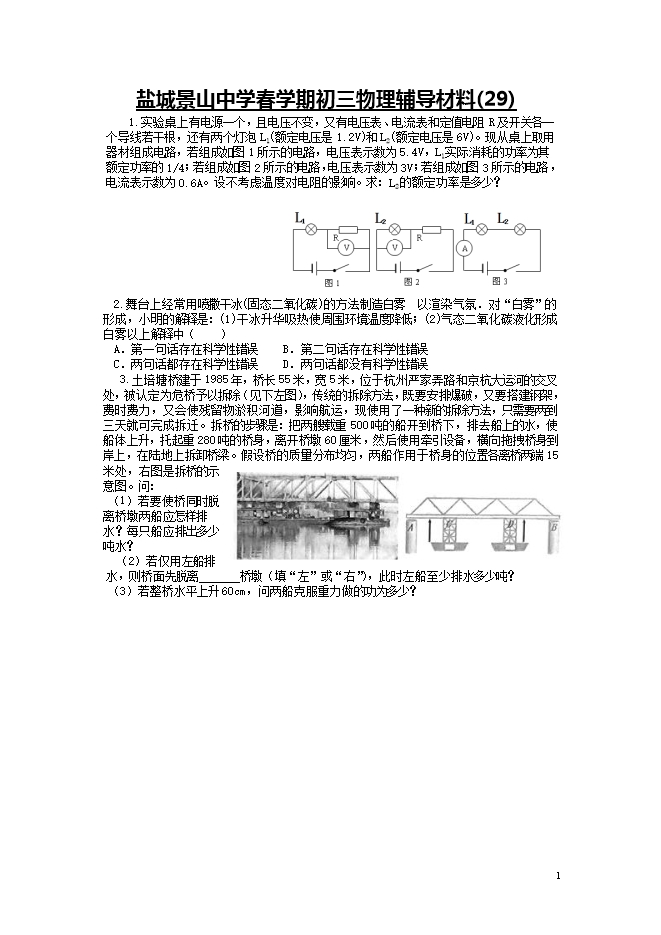 - 2224江苏省盐城市景山中学2016-2017学年九年级下学期初三物理提优班辅导材料26-30(5套打包,无答…