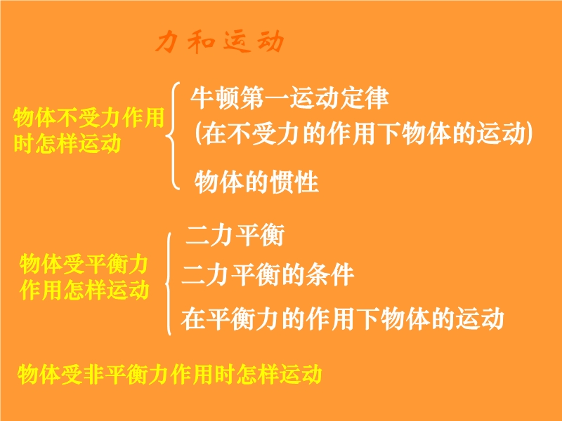 【内容简介】本课件内容主要包括牛顿第一运动定律、惯性、二力平衡的条件、力和物体运动状态的关系等,共由35张幻灯片组成,教学过程设计新颖、重点突出、图片清晰,引导学生温顾了一些重要的实验。教学过程分为三个主题:力和运动,物体受平衡力作用时怎样运动,物体受非平衡力作用时怎样运动等,每个主题都精选了适量的习题。