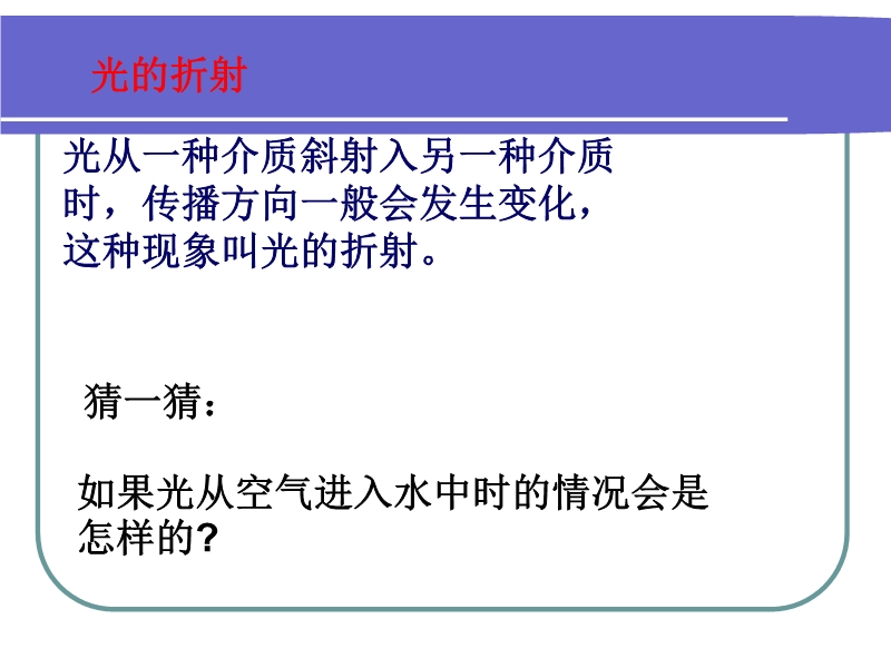 【内容简介】本课件以人教版新教材第二章第四节为基础制作,共由15张幻灯片组成,课件制作紧扣教材,重点突出。课件首先引导学生观察了日常生活中常见的光的折射现象,让学生认识到光会发生折射及折射的概念。然后引导学生通过观察和实验探究了光从空气进入玻璃和从玻璃进入空气时的折射规律,引导学生从理论上进行分析,使学生从感性认识上升到理性的认识阶段。最后精选了典型的习题供课堂练习使用,可进一步深化知识的应用。