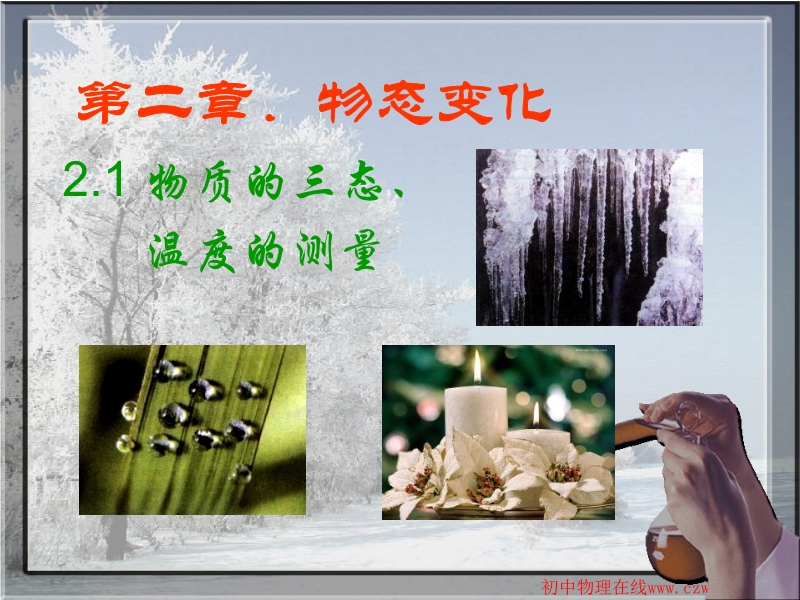 【内容简介】本课件以苏科版新教材第二章为基础制作,共由20张幻灯片组成,并插入了3个flash动画,主要引导学生复习总结本章内容,可供单元复习时使用,也可供中考复习时使用。主要引导学生复习了有关温度和物态变化的知识,教学设计科学、合理,重点突出,能以具体的事例引导学生去认识总结知识的应用,重点在培养学生的应用能力和分析问题的能力。课件中插入的动画,可以帮助理解本章的重点和难点,加深了学生对知识的理解,也使课件更生动、形象。