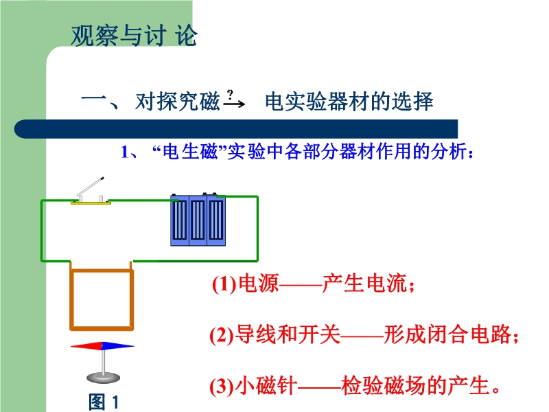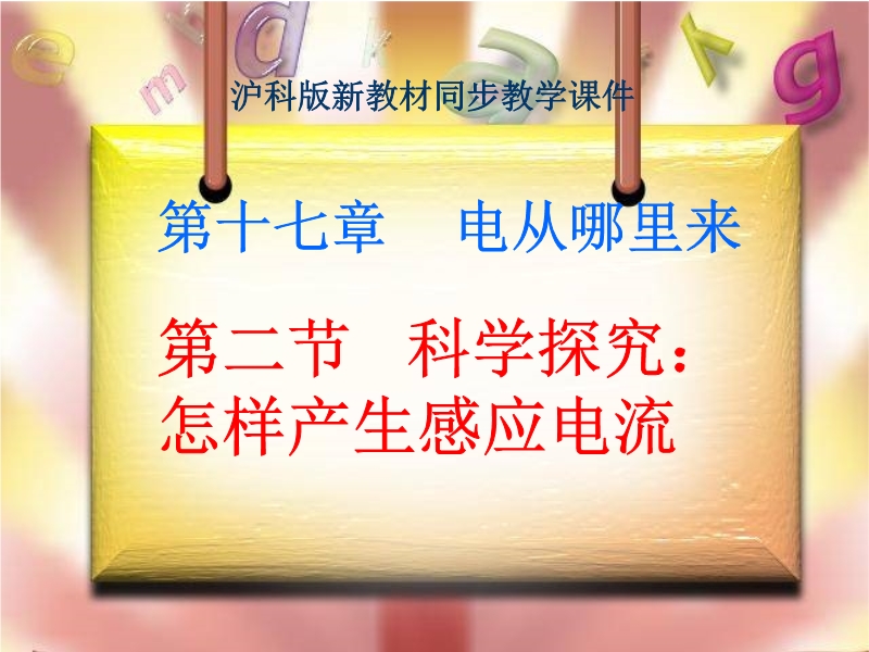 【内容简介】本课件以沪科版新教材第十七章第二节为基础制作,共由11张幻灯片组成,并插入了一个flash动画,制作独特、直观、形象、具体。课件通过引发学生逆向思考,引导学生讨论了如何利用磁场产生电流,并通过flash动画模拟演示了这个实验过程,通过操作可以清楚地观察到感应电流产生的条件。