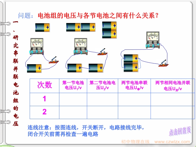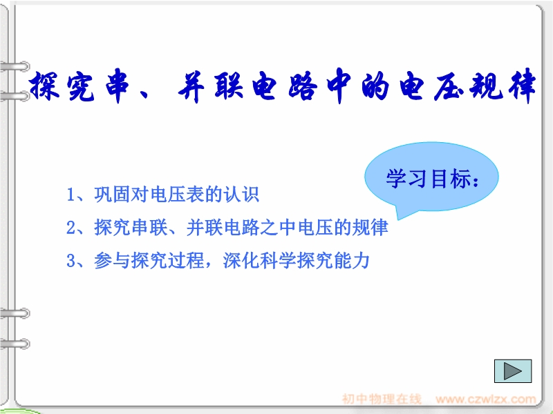 【内容简介】本课件以人教版新教材第六章第二节为基础制作,共由10幻灯片组成。教学过程设计科学、新颖,体现了新的课程理念,注重学生的学习过程和学习方法。课件主要引导学生经历了三个实验过程:电池组串联时电压的特点、串联电路电压的特点、并联电路电压的特点等,使学生在自主探究的基础上去总结知识,能极大地调动学生学习的主动性和积极性。