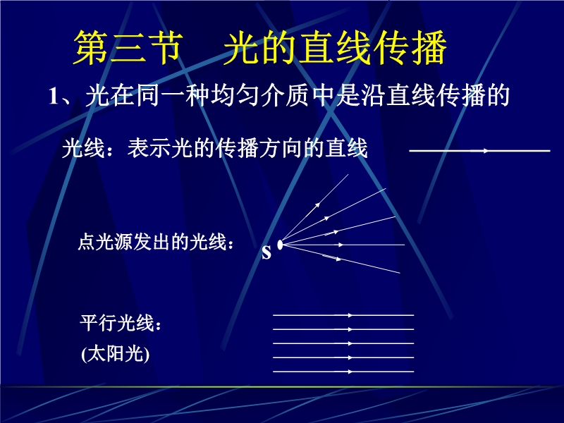 课件特点:注意发挥多媒体特点,根据内容特点,精心设计,集合图,文,像的多种表现功能 ,提交课堂效率,增大课堂容量,课件用PPT制作,便于修改.根据苏教版第3章第3节<<光的直线传播>>制作,为<<光的直线传播>>全节内容,课件运用多种图片和动画以及文字来说明光的直线传播和光的速度,以及一些精选的练习.