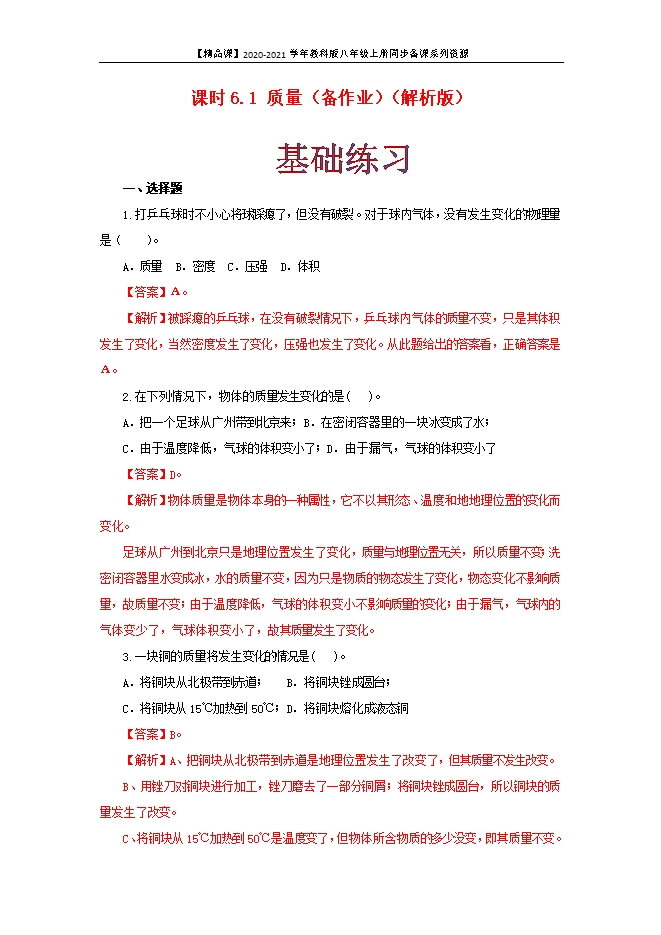 - 333【2025-2026暑假预习讲义】6.1 质量---人教版八年级上册物理(附答案)