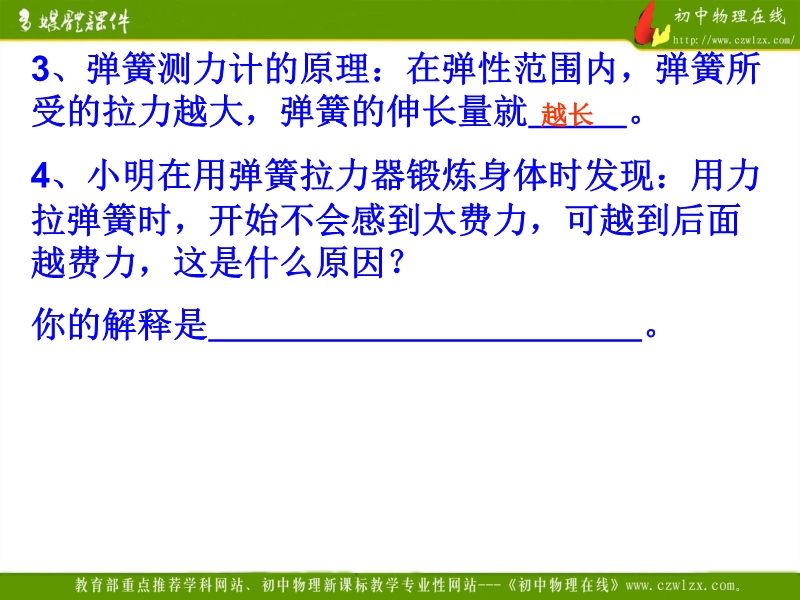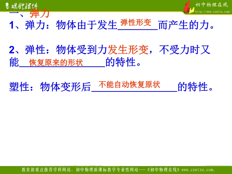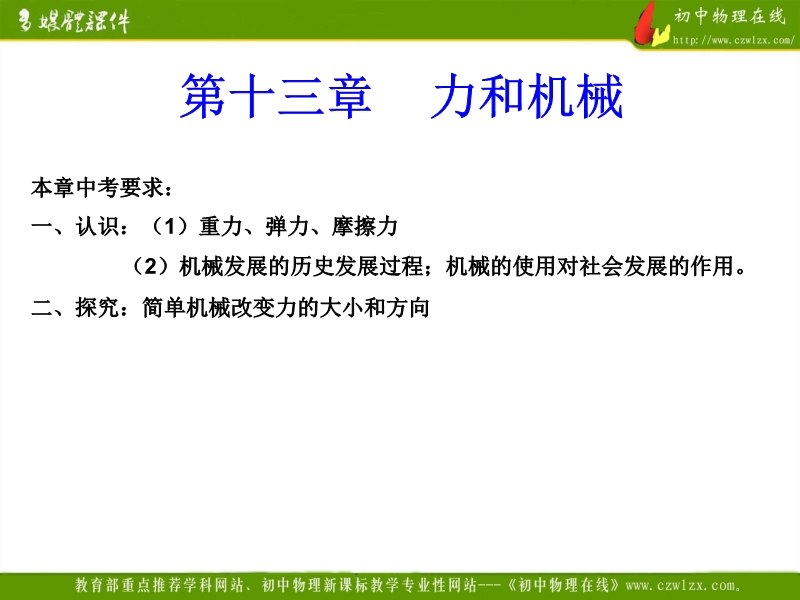 【内容简介】本课件以人教版新教材第十三章为基础制作,主要引导学生复习总结本章内容,共由34张幻灯片组成。本章的内容主要包括重力、弹力、摩擦力、杠杆和滑轮等,课件以了2010年中考试题为平台精心组织了学生对本章知识的复习。