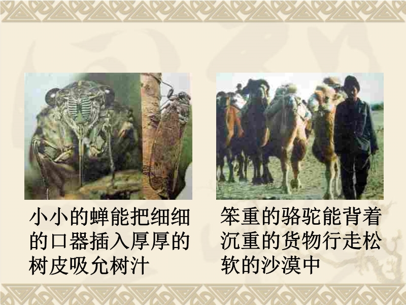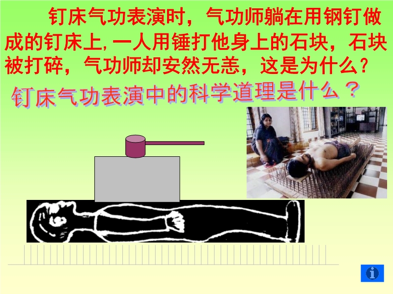 【内容简介】本课件共有39个幻灯片,通过气功师傅在钉床上表演胸口碎大石引入,分析蝉吸允树汁和骆驼在沙漠中托运货物引出压力的作用效果与什么因素有关,通过实验进行验证,分析试验引出压强的概念,再介绍压强的公式、单位、物理意义。在通过公式分析减小、增大压强的方法,以及在生活中压强的应用