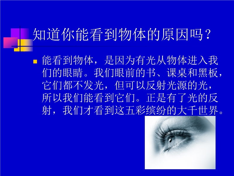 【内容简介】 本课件以教科版新教材八年级上第四章第二节为基础制作,共有17张幻灯片。课件向学生展示了光的反射的规律。