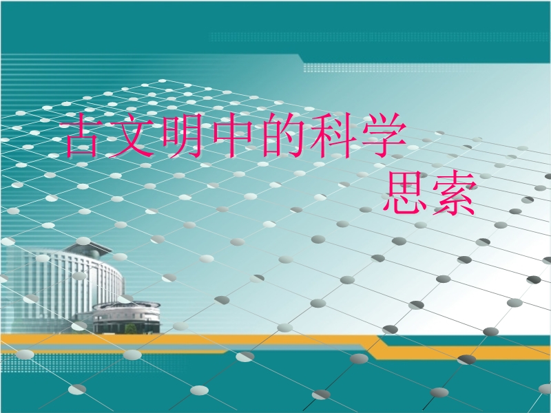 【内容简介】本课件以沪科版新教材第一章第二节为基础制作,共有18张幻灯片。课件展示了古文明中的科学思索,如最早的甲骨文、纳西族的象形文字、中国人天圆地方的宇宙观、英国的石头阵等,这些都显示了古代人对自然和宇宙的探索精神。课件还展示了物理学的进步之阶,展示了物理学的发展及一些科学家的主要贡献。本课件可供教学“探索之路”时参考使用。
