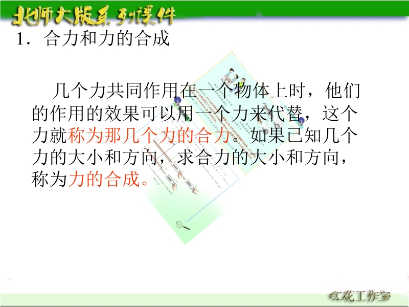 【内容简介】本课件以北师大版新教材第七章第五节为基础制作,共有15张幻灯片。课件引导学生认识了力的合成的概念,引导学生通过实验探究了同一直线上两个力的合成,总结了计算方法。并引导学生用力的合成的知识解释生活中的现象,课件中有例题分析,有巩固练习,可供教学参考使用。