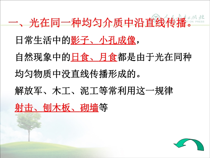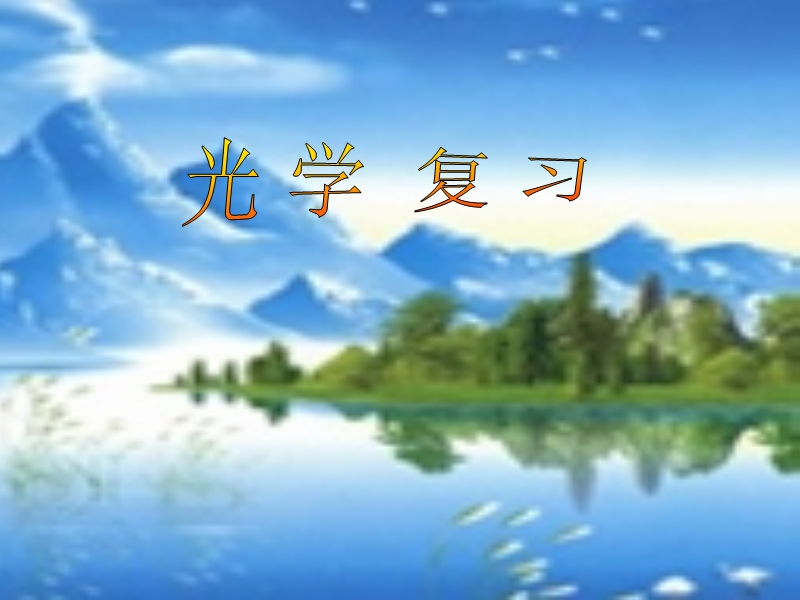 【内容简介】新人教版《光学》ppt复习课件,课件是根据最新人教版教材内容第四和第五章内容制作而成,课件共有涉及初中光学内容,课件有知识的归纳和总结,对重点实验引导学生再现,注重对学生能力的培养,安排了大量习题供教学参考使用。