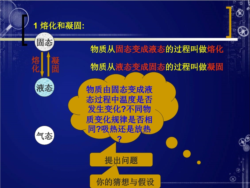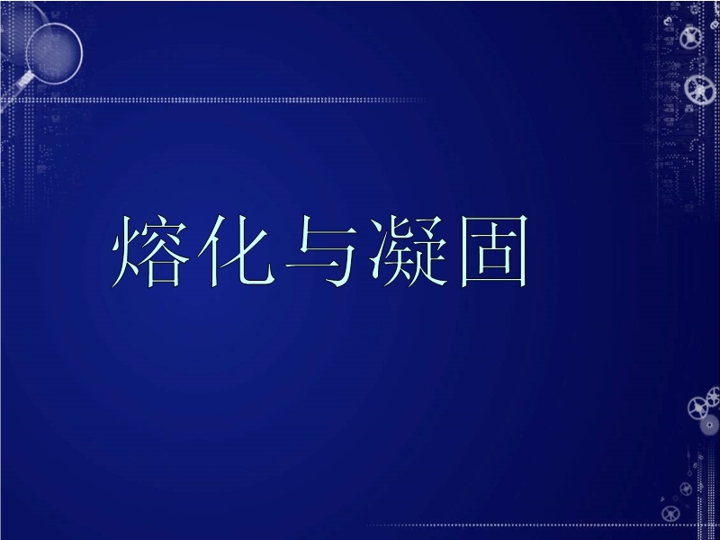 【内容简介】课件以人教版新教材第四章第二节为基础制作,共有16张幻灯片,并插入了8个flash动画。课件展示了生活中常见的熔化和凝固现象,重点引导学生设计实验探究了晶体和非晶体的熔化及凝固特点,认识了晶体和非晶体的区别等,课件的特点:
