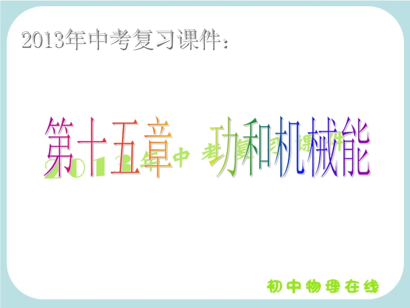 【内容简介】2013年中考复习课件:《第十五章 功和机械能》精品复习课件,课件2013年中考复习而制作,课件共54张幻灯片,课件首先引导学生系统地复习巩固了功、功率、动能和势能等机械能相关知识点,课件在精选中考试题的练习基础上组织学生复习,引导学生将知识与应用相结合。
