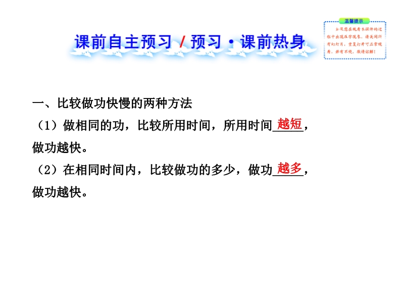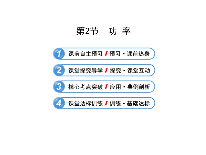 【内容简介】人教版精讲精练系列复习课件《11.2功率》ppt课件,课件,41张幻灯片组成,分四个部分组成:1课前自主预习:以填空的形式呈现,对教材的主要知识点:功率的定义、公式等温习,使得知识网络化,2课堂探究导学环节:在线本节重难点知识点:功率的意义等进行解析,是上课的重点部分,3,核心考点突破环节:通过例题的呈现提高学生的能力,4课堂达标训练:进一步培养学生独立思考的能力。课件中的习题、例题都是精选自2011、2012年全国中考试题。