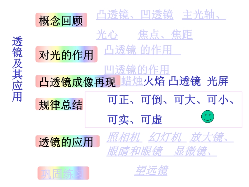 【内容简介】人教版:《第五章 透镜及其应用》ppt复习课件,本课件以人教版新教材第五章为基础制作,共有25张幻灯片。主要引导学生详细而具体地回顾了本章的主要内容,展示了本章的具体知识,知识点进行回顾知识,并精选了典型的例题和习题,能进一步提高学生的技能,提高学生综合分析和解决问题的能力。