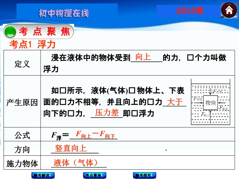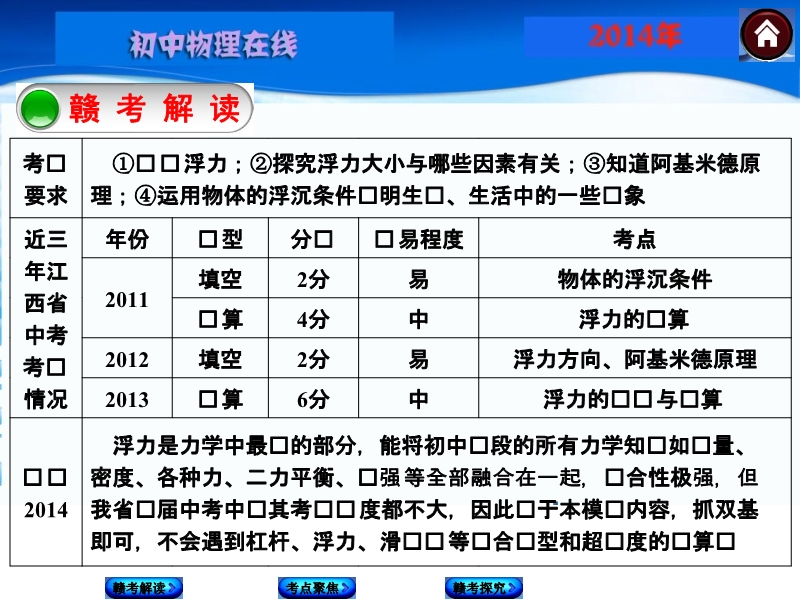 【内容简介】2014江西中考复习课件《第13课时 浮力》ppt课件,课件共24张幻灯片,课件从三个环节组织复习:1赣考解读 解读2011-2013三年江西省中考考查情况:题型、分值、难易程度和涉及的考点,预测了2014年江西省命题的形式、分值等。2 考点聚焦,本环节采用填空的形式,按知识点分别展示了:考点1 浮力 考点2 浮力的大小 考点3 浮沉条件及应用。2、赣考探究,以2011-2013年江西省省、各市试题中考试题载体展示常见的题型等,通过课件展示解析,总结方法,提高学生能力,供教学参考使用。