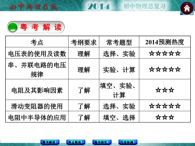 【内容简介】2014中考复习方案课件(广东专版):第16单元 电压 电阻,课件共有31张幻灯片。课件首先通过“粤考解读”环节引导学生认识了本章知识点在考纲要求,常考题型和展望14年各个知识点的考察的热度,课件再通过“考点 聚焦”在现本章知识要点:电压及其测量 电阻 变阻器 ,进一步熟悉教材。课件的重点“粤考探究”按考点分类型,以2013中考试题为抓手组织学生复习。