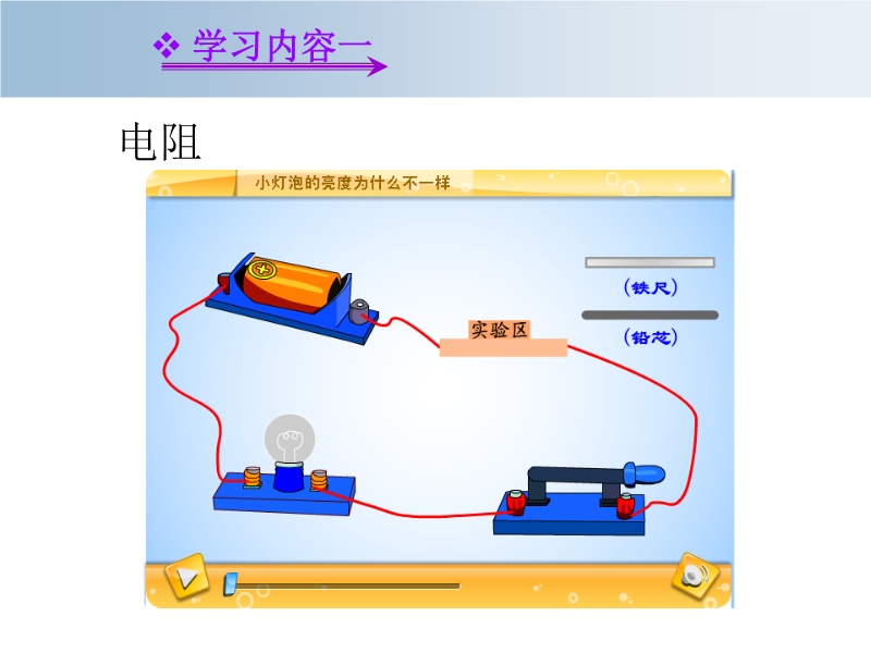 【内容简介】人教版:《16.3电阻》ppt+flash课件,课件共有23张幻灯片和2个内嵌动画。课件引导学生认识了导体对电流有阻碍作用,学习了电阻的定义、意义、单位,课件还引导学生猜想了电阻的大小可能与哪些因素有关,并通过实验探究了影响因素,同时动画模拟演示。