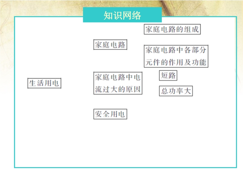 【内容简介】2015年人教版单元复习课件:《第十九章 生活用电》ppt课件,课件共有18幻灯片,课件分入下几个环节:1.知识网络,进一步理清本章的知识点形成知识网络化,2,基础知识再回首,再现本章主要知识要点。3.典型例题精讲,精选典型试题,就中考中的热点展示例题,提高能力。4易错习题集,列举学生在月考和平时训练中易错题目。