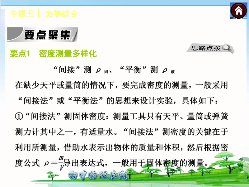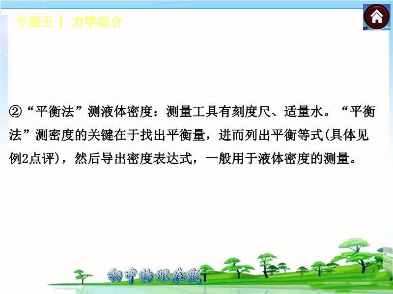 【内容简介】2015届人教版中考复习方案(安徽省):《专题突破五 力学综合 》ppt课件,课件根据现行的人教版教材编辑的15届中考复习课件,课件共23张ppt幻灯片,课件通过要点聚焦,按照如下要点:要点1 密度测量多样化 要点2 力学综合计算