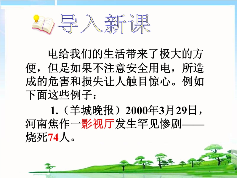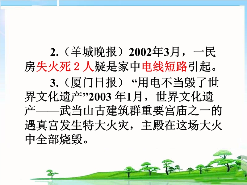 【内容简介】人教版《19.2家庭电路中电流过大的原因 》ppt+视频课件,由29张幻灯片组成和3个flash格式视频文件。课件引导学生通过生活中的用电实例用电功率的知识分析了家用电器功率过大和短路可能带来的危害,介绍了熔丝的作用和原理等。课件设计较新颖,重点突出。