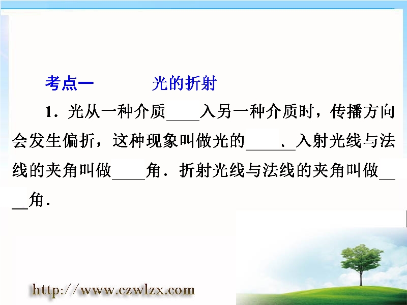 【内容简介】【中考备战策略】2015年中考物理(人教版)总复习:《第6讲 光现象二》PPT课件,课件共81张ppt幻灯片,课件首先对本章内容进行考点知识梳理,,第二部分是中考典例精析,课件归纳中考重要考点同时分析该考点的命题点:考点一:光的折射(命题点:(1)生活中的折射现象实例;(2)光的折射规律)考点二:光的色散(命题点:(1)色散现象;(2)物体的颜色;(3)红外线、紫外线),以中考试题为抓手,通过评析试题,进一步巩固知识点,同时提高学生的解题能力,课件的第三部分是巩固练习,精选道试题进一步提高运用知识的能力。课件最后部分考点训练,该部分是一套试卷,由选择题、填空题、实验探究题和计算题,该部分内容按中考要求制作(20道试题)。