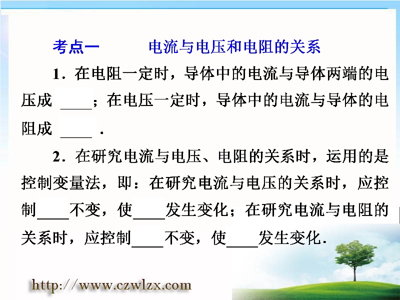 【内容简介】【中考备战策略】2015年中考物理(人教版)总复习:《第19讲 欧姆定律》PPT课件,课件共95张ppt幻灯片,课件首先对本章内容进行考点知识梳理,,第二部分是中考典例精析,课件归纳中考重要考点同时分析该考点的命题点:考点一:电流与电压和电阻的关系 命题点:(1)探究电流与电压的关系;(2)探究电流与电阻的关系.考点二: 欧姆定律及其应用 命题点:(1)欧姆定律的内容、公式;(2)电阻的串联;(3)电阻的并联.考点三:电阻的测量命题点:(1)伏安法测电阻的原理;(2)实验注意事项;(3)滑动变阻器的使用,以中考试题为抓手,通过评析试题,进一步巩固知识点,同时提高学生的解题能力,课件的第三部分是巩固练习,精选道试题进一步提高运用知识的能力。课件最后部分考点训练,该部分是一套试卷,由选择题、填空题、实验探究题和计算题,该部分内容按中考要求制作,15道试题,供课后训练或测试,课件对每道试题都提供点评和评析。