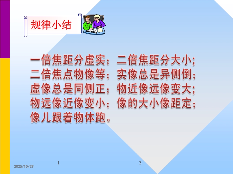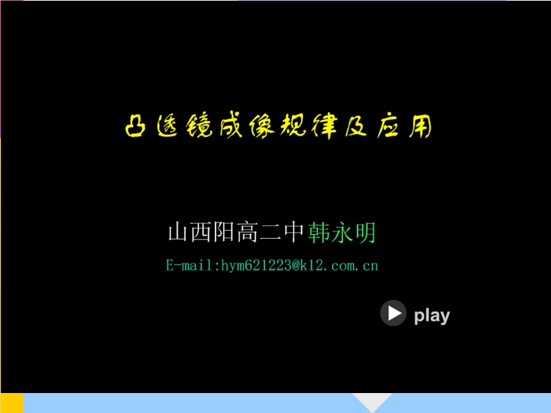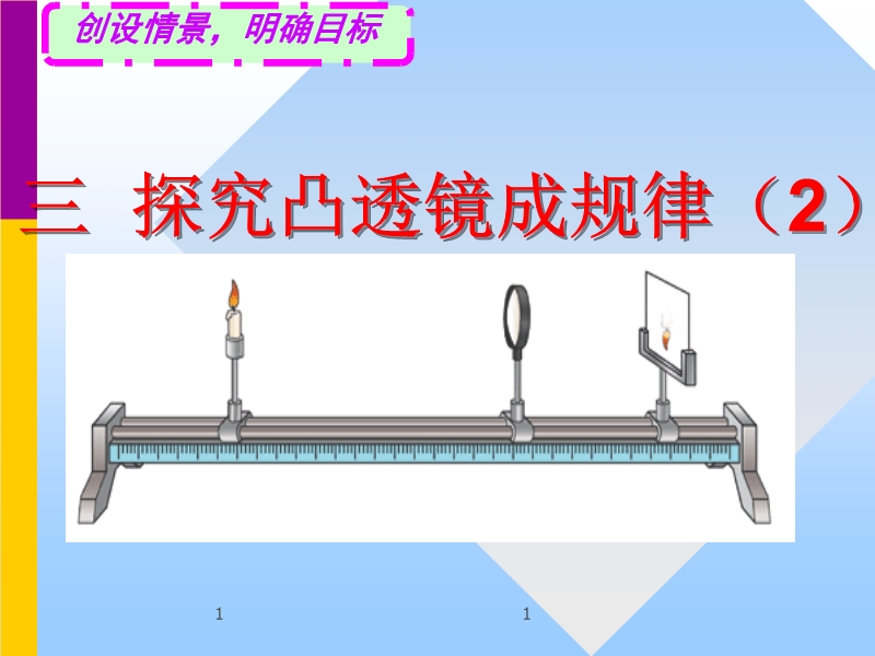 【内容简介】人教版;《5.3探究凸透镜成像规律》PPT课件,共有14张幻灯片,并插入了一个flash动画。课件首先引导学生设计实验探究了凸透镜成像的特点,并用flash动画作了模拟演示,课件同时通过PPT采用作图的方法认识三个像的特点。