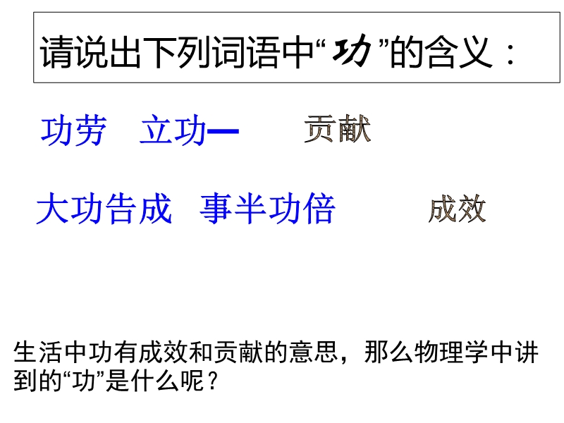 【内容简介】人教版:《11 1功》PPT课件(1),共有29张幻灯片。课件通过具体的生活中的实例,引导学生找出共同点,在此基础上学习了做功的概念、功的意义、功的单位,并讨论了做功 的两个必要因素,最后讨论了功的计算。