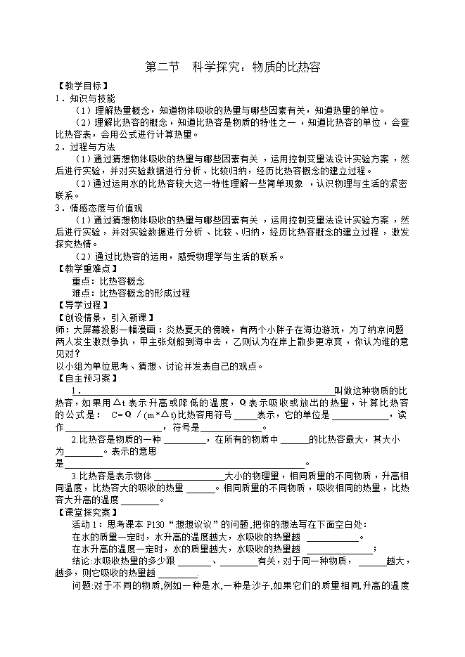 (1)通过猜想物体吸收的热量与哪些因素有关,运用控制变量法设计实验方案,然后进行实验,并对实验数据进行分析、比较、归纳,经历比热容概念的建立过程,激发探究热情。