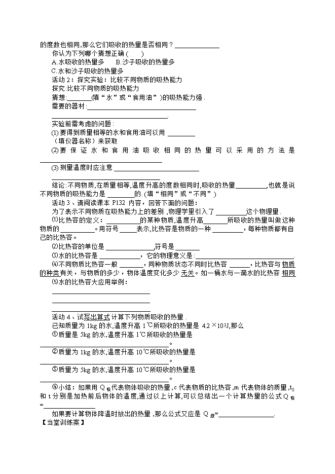 (2)理解比热容的概念,知道比热容是物质的特性之一,知道比热容的单位,会查比热容表,会用公式进行计算热量。