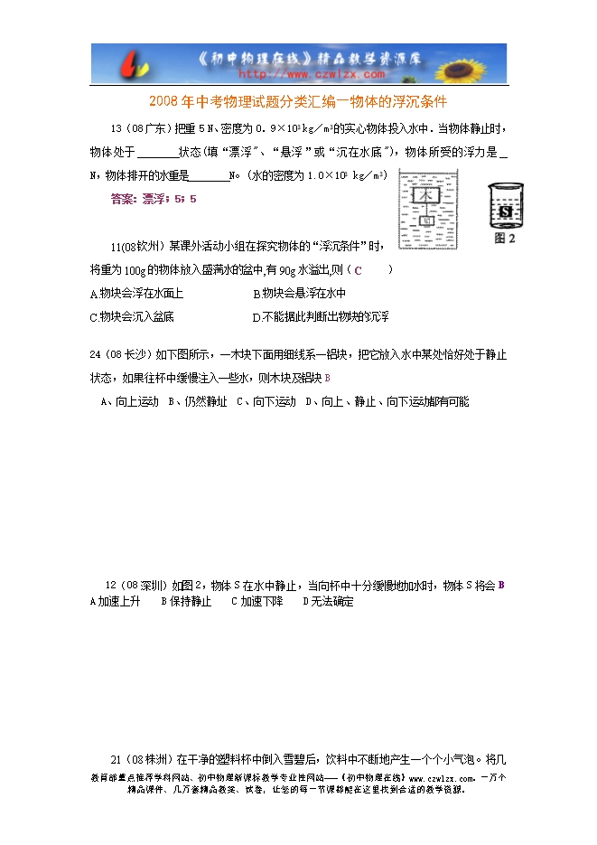 2008年中考物理试题分类汇编—漂浮的分析与计算