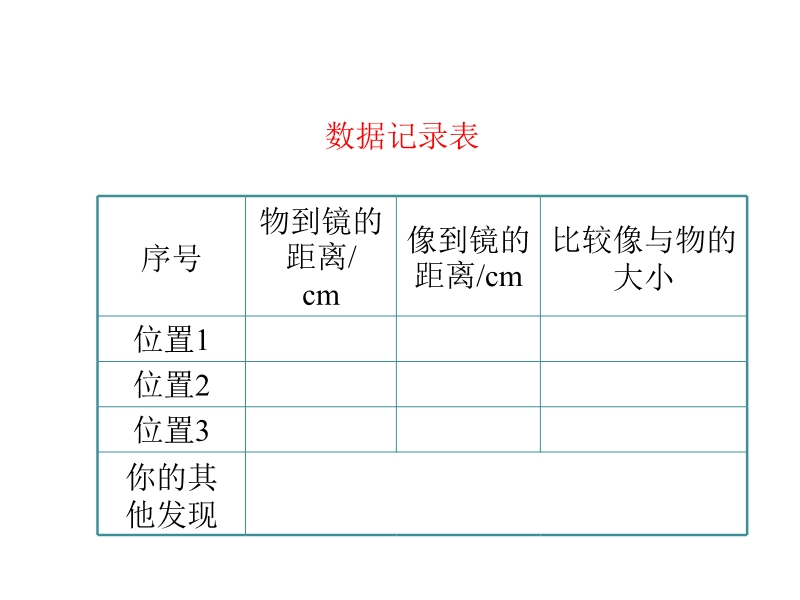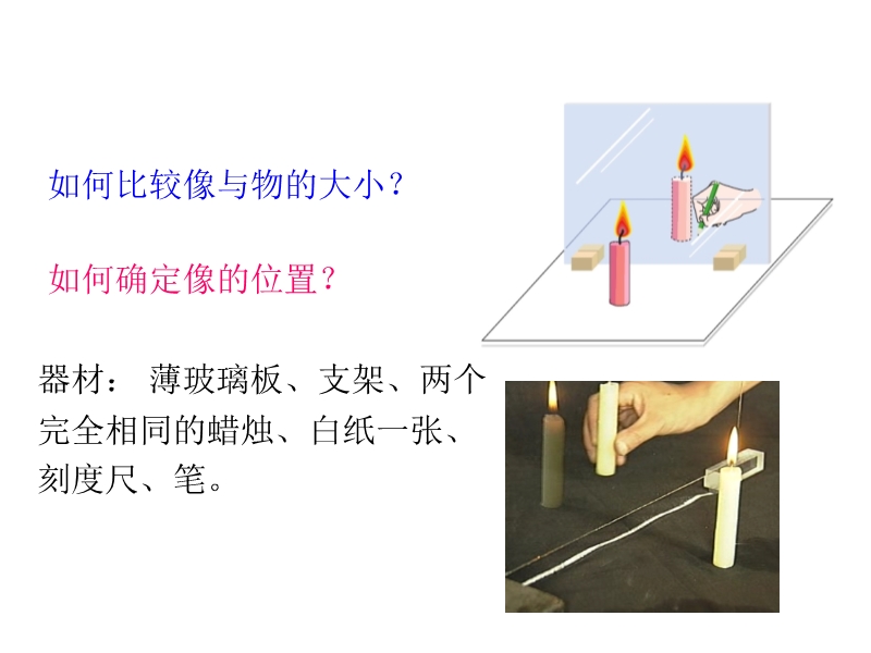 学生分组器材:一块玻璃板,一张8K白纸,一盒火柴,两根等高的蜡烛,刻度尺,笔