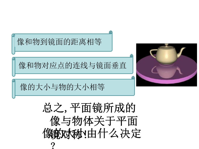 1、通过对平面镜的物与像对称的讨论,领略平面镜中的简洁对称之美。