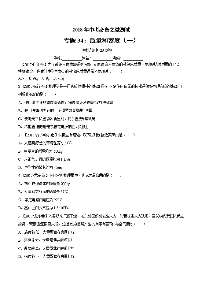 - 19592018年中考物理必备之微测试:专题58 分子热运动(word原卷版和解析版)